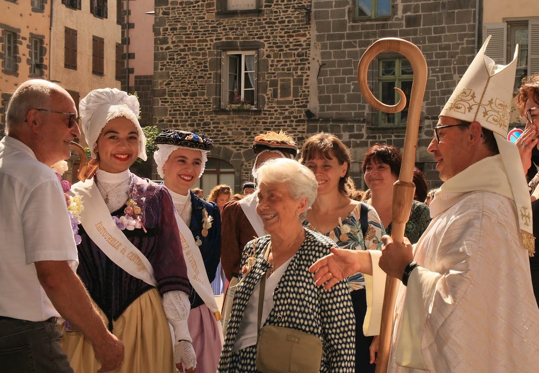 Le vendredi 16 Aout sous un soleil radieux, dès le début d’après-midi, se pressent, par petits groupes autour de la cathédrale, des pastourelles de toutes générations. Alors que chacun prend place à l’intérieur de la cathédrale fleurie pour l’occasion de bouquets de nos montagnes, ces ambassadrices de nos territoires et de nos valeurs amicalistes se regroupent joyeusement pour organiser la procession d’entrée. Tout devant, la plus ancienne pastourelle présente ce jour-là, pastourelle de la Lozère en 1955 et quelle pastourelle ! Louisette MESSONNIER, plus connue plus tard en tant que déléguée générale au folklore de notre confédération sous le nom de Louisette ROUSSET. Elle partage cette première place avec notre pastourelle de la Ligue en titre, Ella PIGANIOL arborant la symbolique houlette et illustrant par ce « côte à côte » féminin, cette transmission entre les générations.