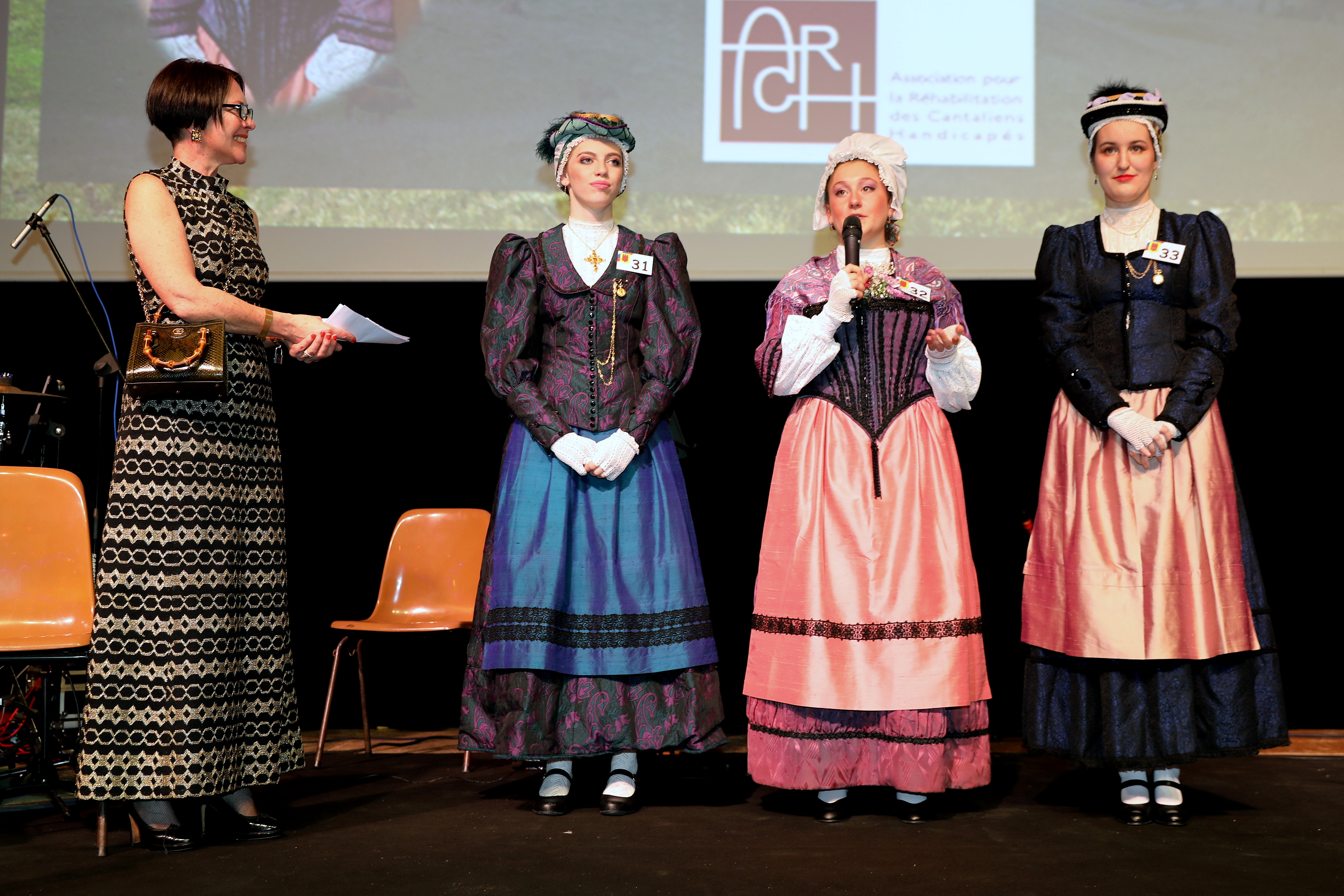 Le chapitre suivant fit entrer la soirée dans le vif du spectacle, passant des fougueux pas de bourrée à la présentation des 3 candidates pastourelles, animée avec brio les deux pétillantes maîtresses de cérémonie : Laetitia MERCIER, antiquaire, acheteuse dans l’émission télévisuelle : « Affaire conclue » et pdte du Prix Art’Verne 2026 et Carole DELBOUIS, responsable de la communication à la Ligue.